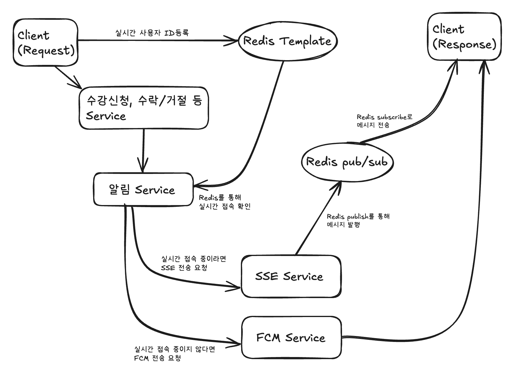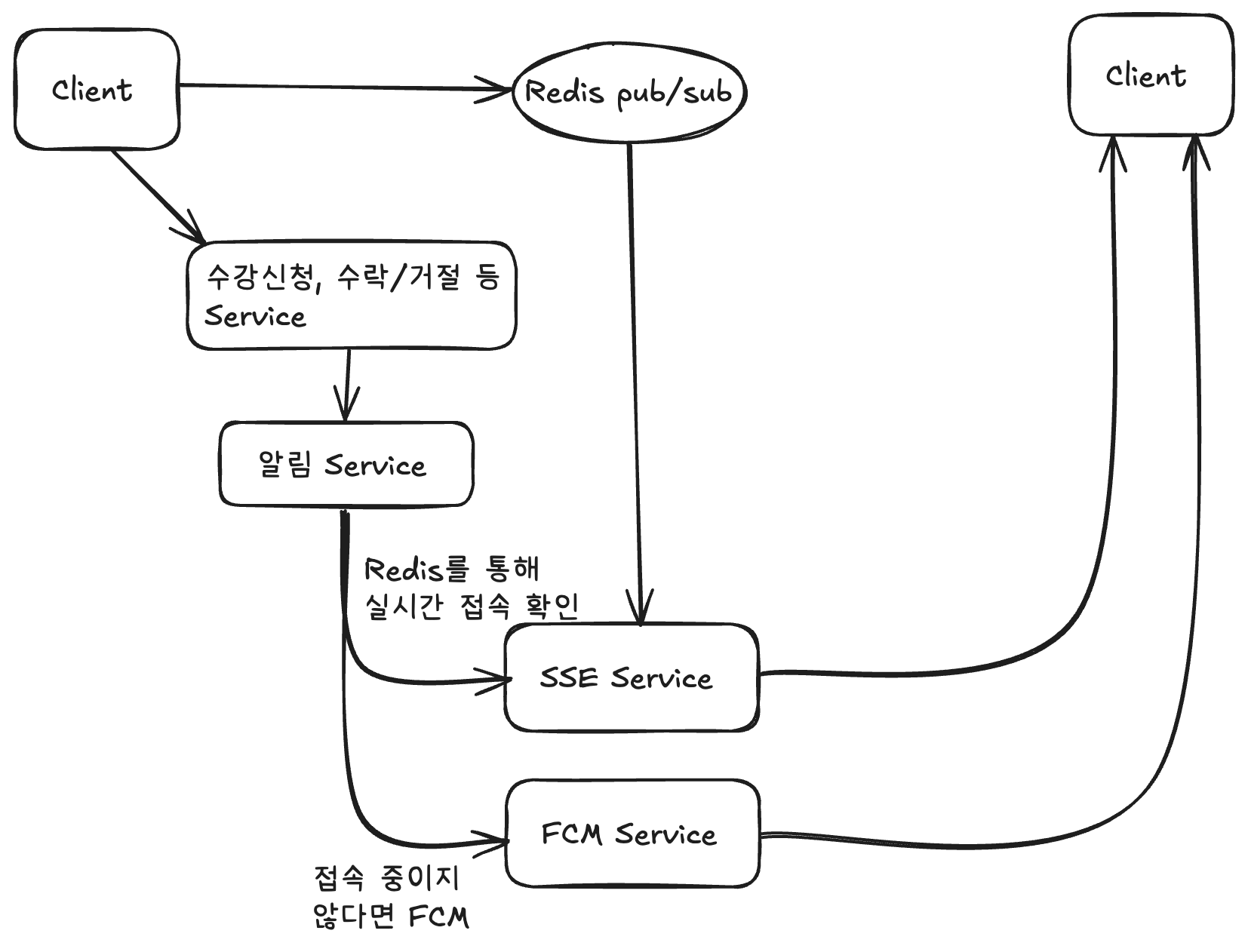 | 사용자가 웹 브라우저에서 사용 중일 때 | SSE | 서버와 연결 유지로 빠른 실시간 알림 제공, 즉시 알림 수신 가능 |