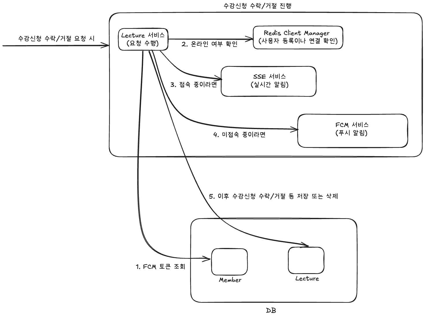 수강 서비스 --> 알림 서비스(접속 중이라면 sse 서비스 호출, 미접속 중이라면 fcm 서비스 호출)