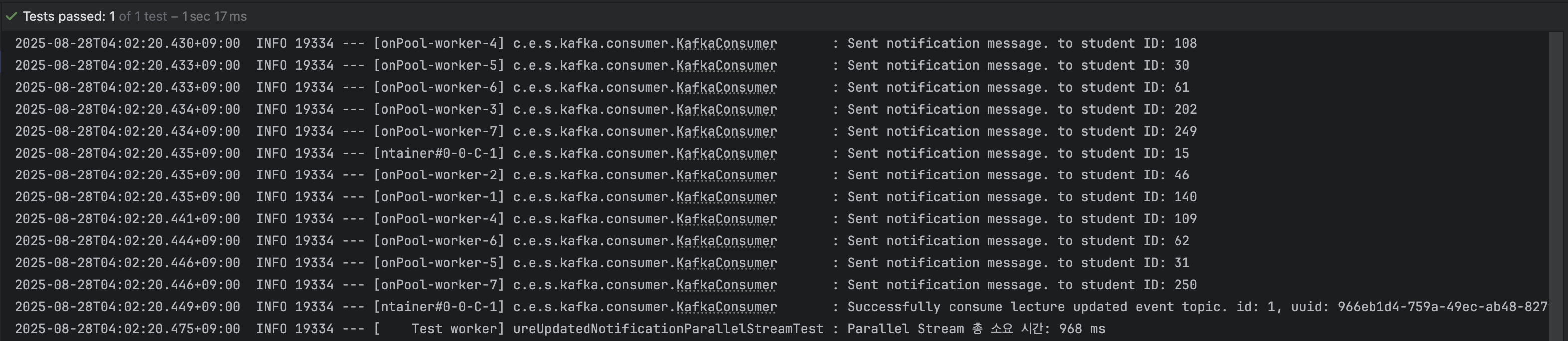 이때 알림 처리가 늦어지면 강남에 있는 모든 학생에의 알림이 지연되는 것이죠. 이 문제를 해결하기 위해 카프카 컨슈머의 알림 처리 로직에 병렬 처리를 도입하여 알림 전송 성능을 개선해보기로 했습니다.