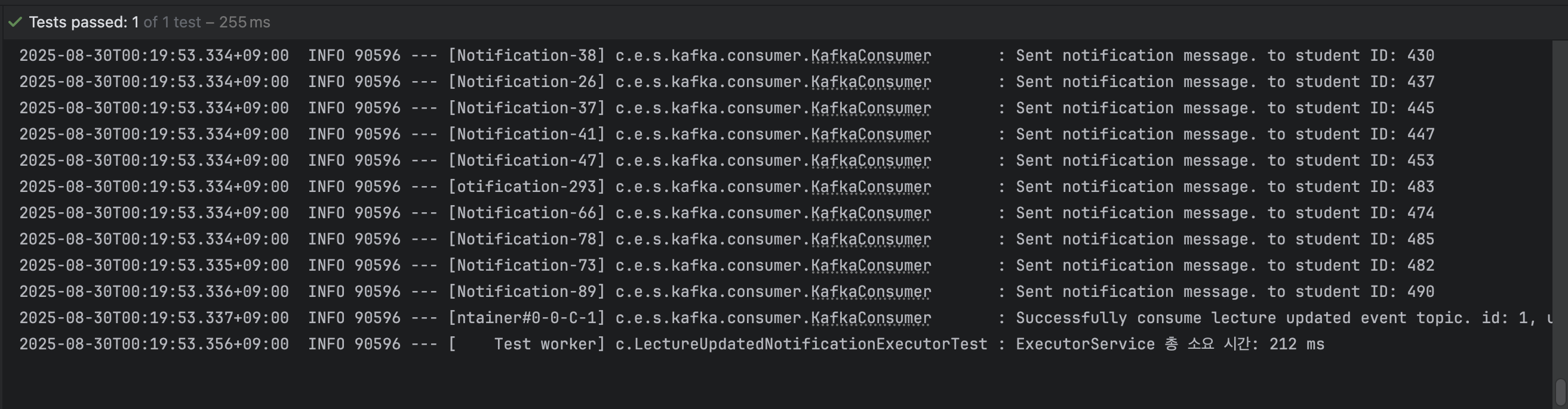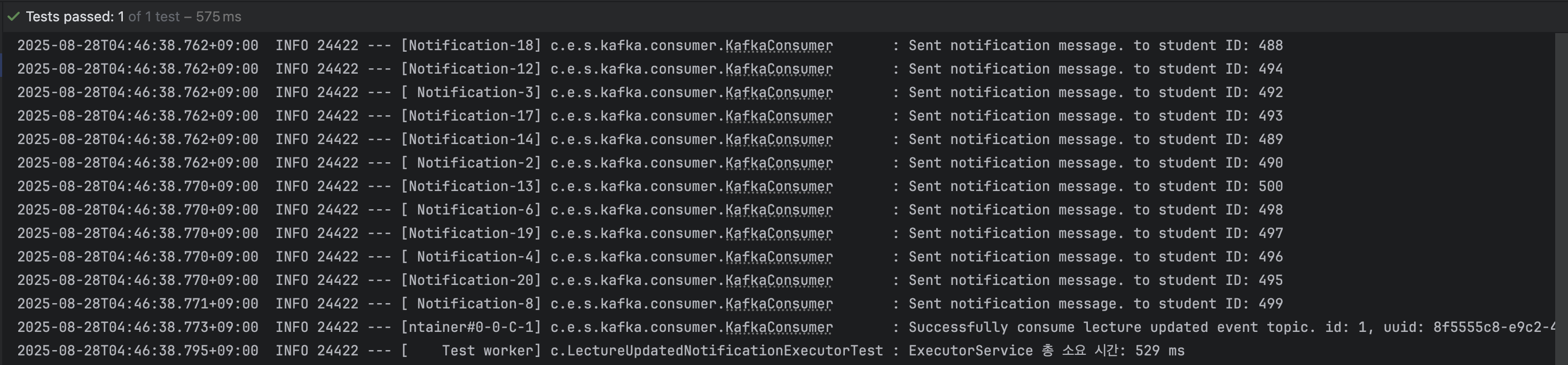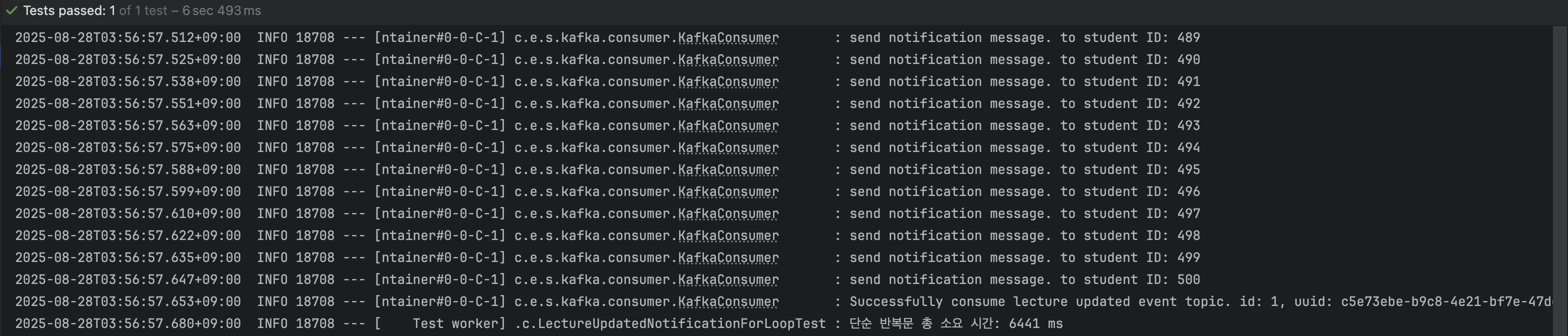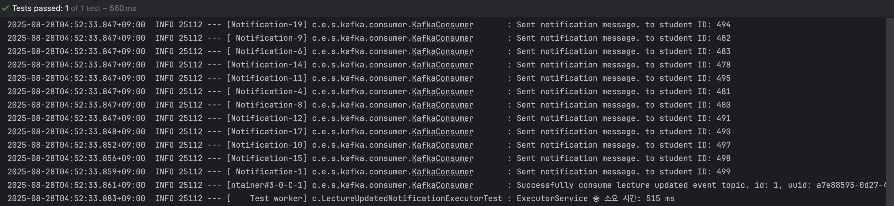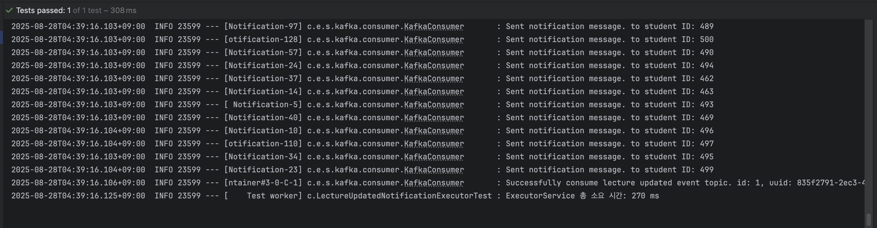 - 정확한 시간 측정: 스프링의 StopWatch로 전체 작업 시간을 측정하고, @KafkaListener가 비동기로 동작하므로 CountDownLatch를 이용해 500개의 알림 처리가 모두 완료될 때까지 대기하도록 구현했습니다.