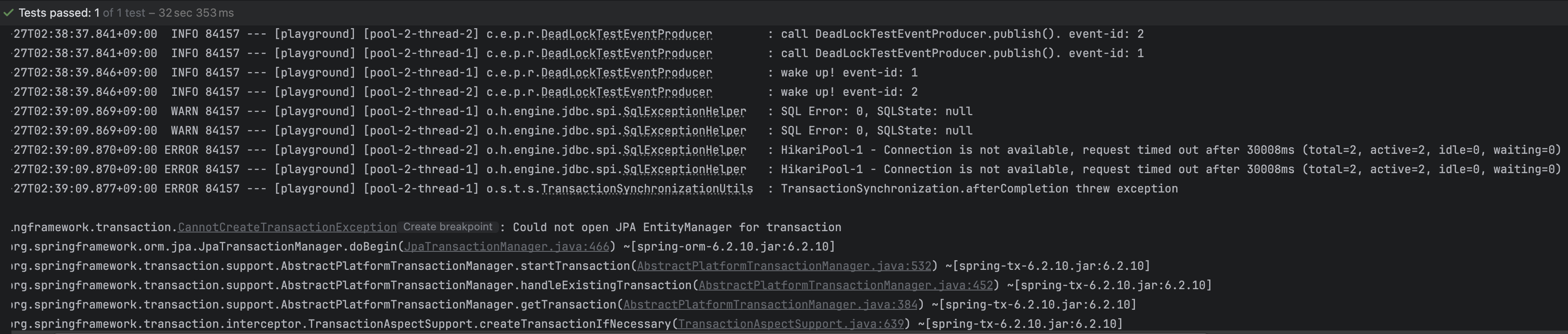 - 쓰레드 1 블로킹: DeadLockTestEventListener의 handleEvent가 호출됩니다. 이 메서드는 REQUIRES_NEW이므로 새로운 커넥션을 요청합니다. 하지만 남은 커넥션이 없으므로 쓰레드 1은 커넥션 풀에 커넥션이 반납되기를 기다리며 대기(Blocking) 상태가 됩니다.