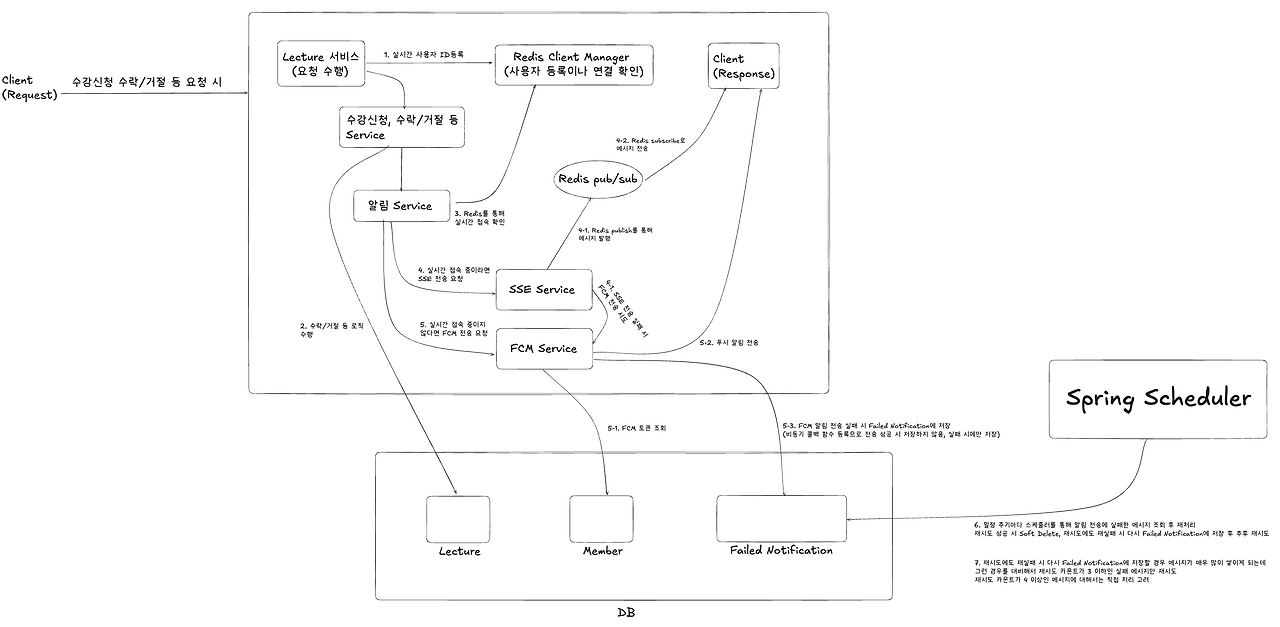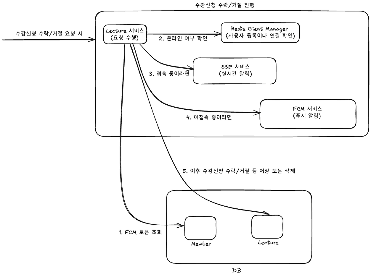 - 알림 발행자(Publisher): 알림 이벤트를 만드는 쪽(예: 강의 정보 수정 API)은 더 이상 클라이언트의 SSE 연결 상태를 알 필요가 없습니다. 그냥 Redis에 메시지를 던지기만 하면 됩니다.